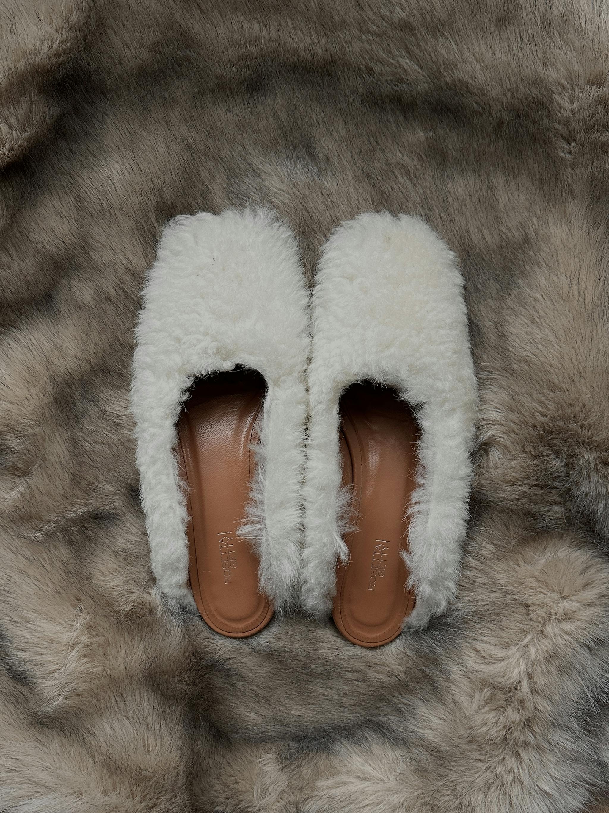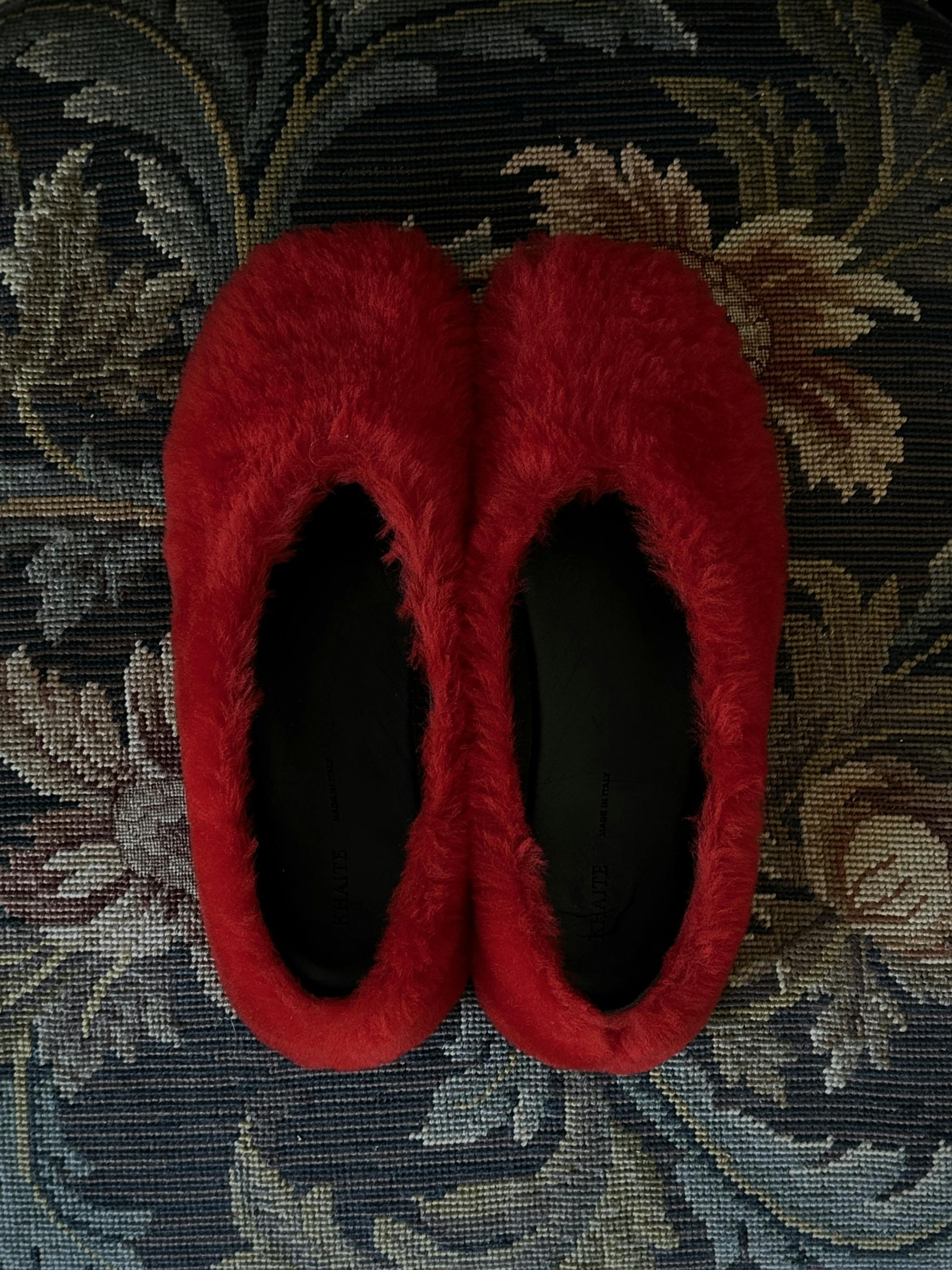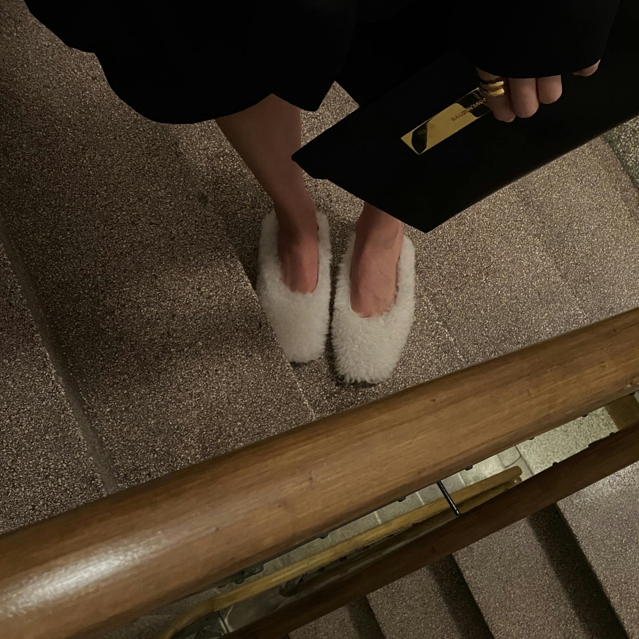 More and more events required more and more shoe models to choose from. For Christmas that year, my family gifted me (ok, I made them) a pair of flat, pointy, black-and-cream woven pumps by Proenza Schouler, a shoe so beautiful I was tempted to build it a shrine. At Topshop, I ordered my very first pair of fur sandals—shoes I’d wear for years and which laid the foundation for what has since become a ridiculously large collection of fluffy footwear. MSGM released the first and so far only pair of sneakers I have ever been truly excited about: white, chunky, and adorned with oversized ruffles. A design by Rosetta Getty was my first foray into shearling, and Khaite’s Cate Holstein led me to venture into heels: ruched silk with a pointy toe in bright pink. And with every new purchase, the passion grew.