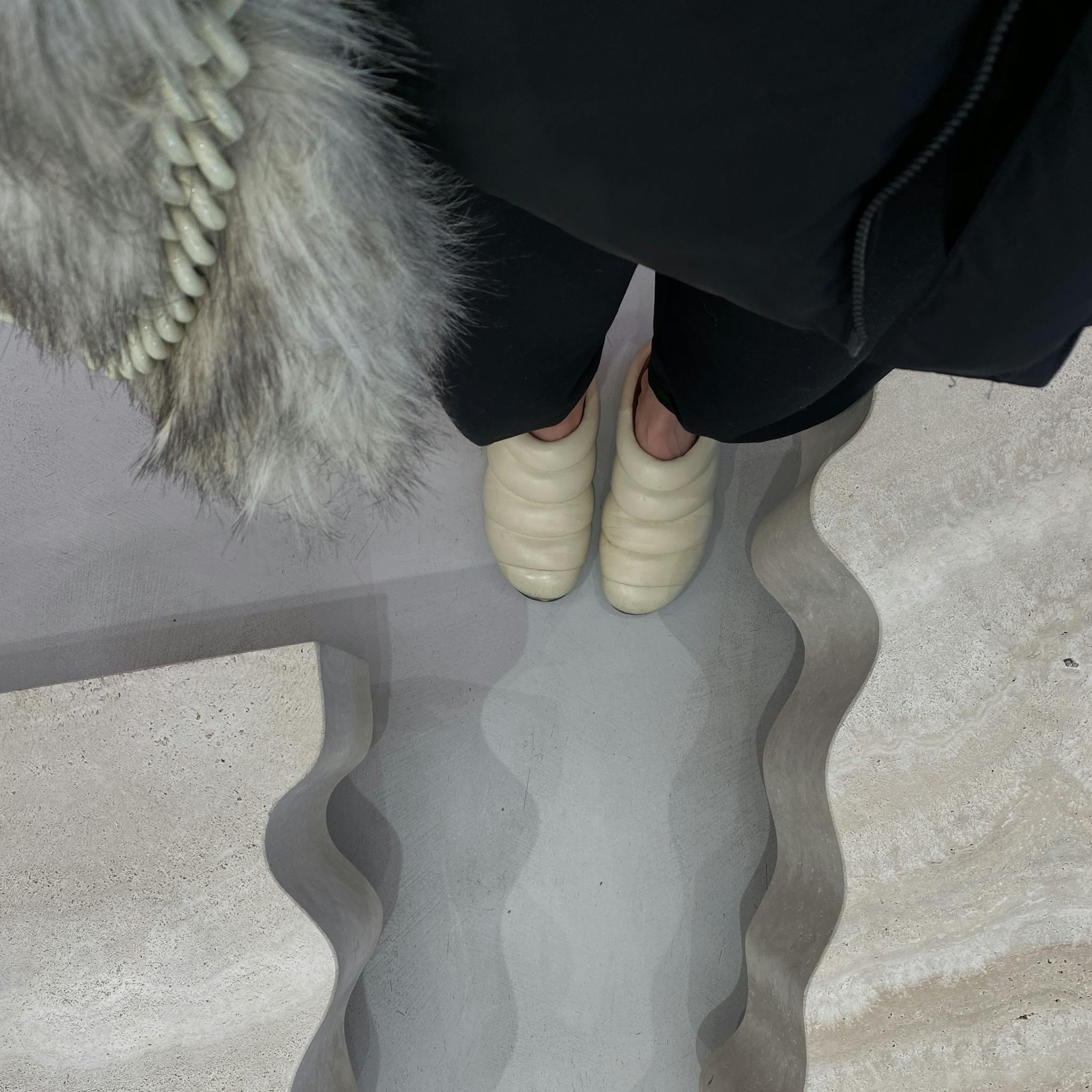 Kalte, nasse Wintertage lassen mir in Sachen Schuhwerk nur eine Handvoll Optionen und keine befriedigt mich so richtig: grasgrüne Gummistiefel, ein Paar schwarze Leder-Flats mit einem Streifen dunkelbraunem Fell oder, wenn das Wetter wirklich dramatisch schlecht ist, schwarze Combat Boots. Es sei denn, die Temperaturen sinken tief genug, um eine sehr seltene, meist extrem kurze dritte Saison einzuläuten, die mein Shoe-Game kurzzeitig wieder in Gang bringt: die Moon-Boot-Saison. Mein Lieblingspaar ist aus Mohair im Kuhmuster. Ich liebe sie mehr als Raclette.