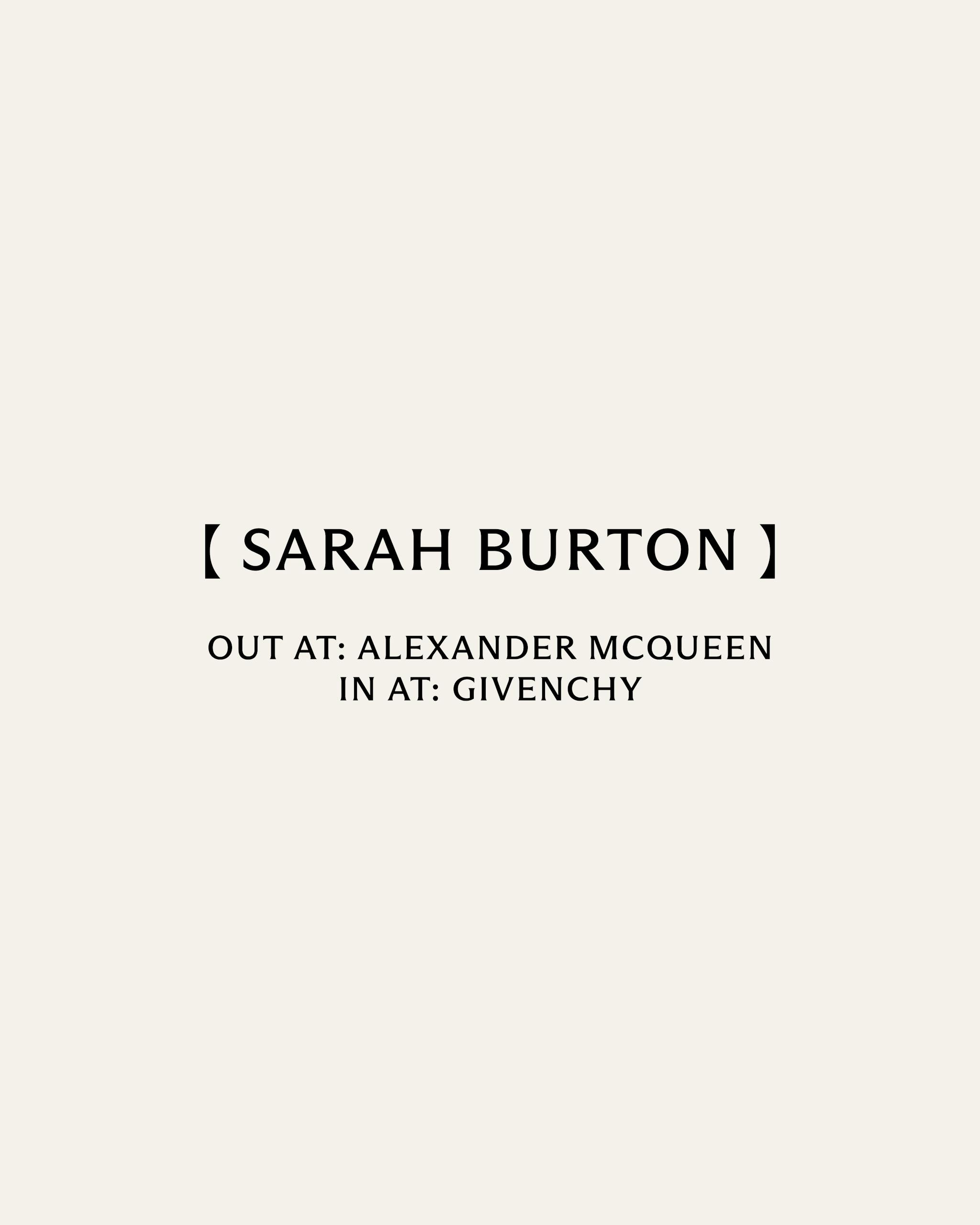 Lorsque Sarah Burton rejoint le légendaire Alexander McQueen en 1996, elle est loin d’imaginer que, quatorze ans plus tard, elle serait chargée de préserver son héritage après sa disparition tragique. Durant les treize années qui suivent, elle parvient à équilibrer avec finesse l’ADN sombre et théâtral de la maison avec une élégance plus fluide et portable. Reconnue pour fusionner romantisme et innovation structurelle, Burton explore le contraste dans ses créations : une coupe précise adoucie par des étoffes aériennes, des techniques modernes enrichies de références à la haute couture historique. Après 26 ans au sein de la maison, elle annonce son départ en septembre 2023. Un an plus tard, elle est nommée directrice artistique de Givenchy. Sa collection de début pour la maison française a été dévoilée le 7 mars lors de la Fashion Week de Paris et a été saluée comme un retour réfléchi aux origines de la maison : une coupe précise et une élégance intemporelle.