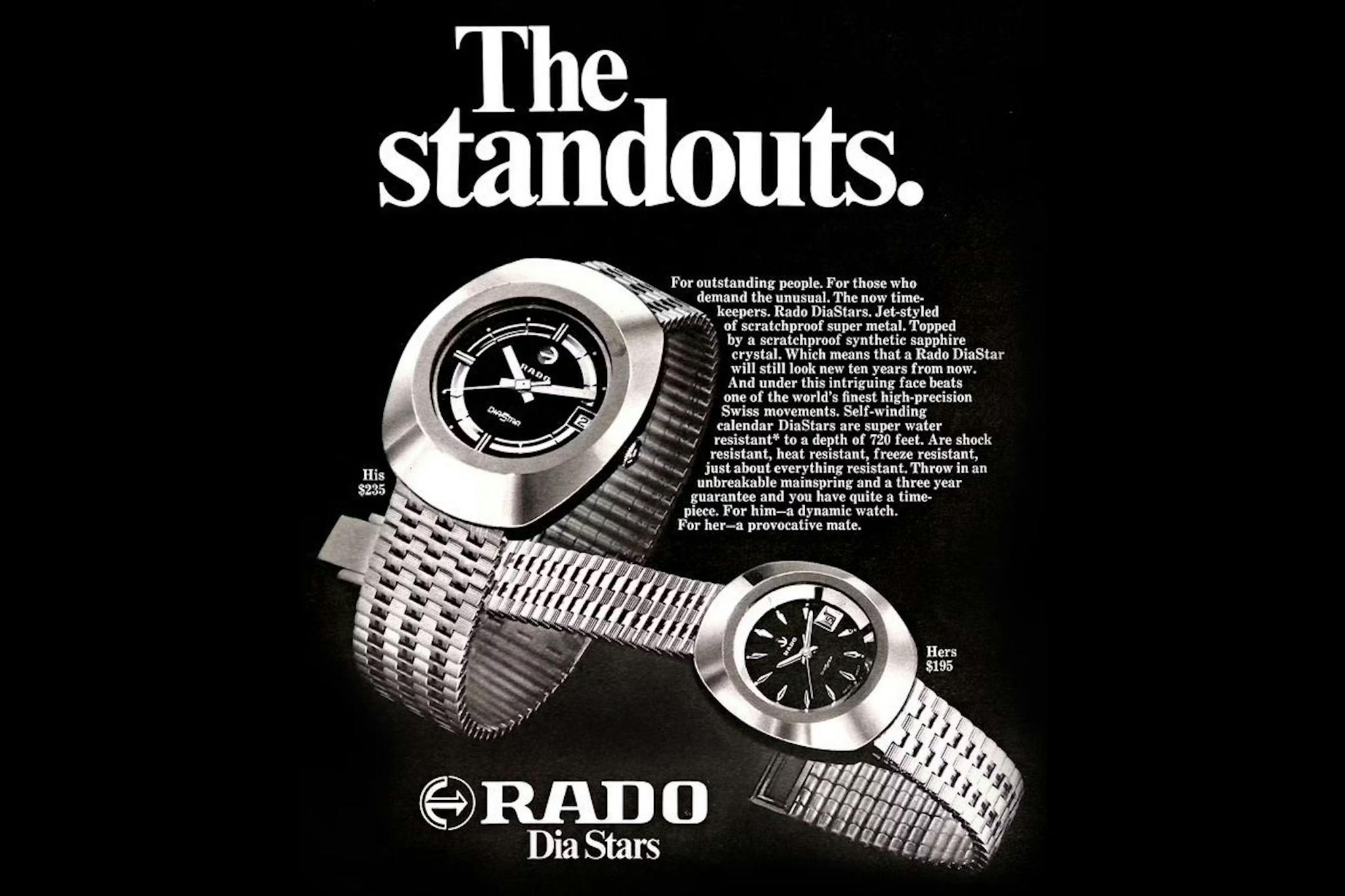 Die erste Marke, die erfolgreich Hightech-Keramik in einem Uhrengehäuse einsetzte, war Rado mit der DiaStar von 1962, einem Modell mit Gehäuse und Armband aus Wolframkarbid, beworben als die erste kratzfeste Uhr der Welt. Streng genommen ist Wolframkarbid jedoch keine Keramik, sondern lediglich keramikähnlich und mit doppelter Dichte gegenüber Stahl erstaunlich schwer, was bedeutete, dass die DiaStar 1 aus Gründen des Tragekomforts im für die damalige Zeit winzigen 35-mm-Format produziert werden musste. Wolframkarbid, so war sich die Branche bald einig, war keine massstabsetzende Innovation – aber es fungierte als Initialzündung für die Einführung von echter Keramik in der Uhrmacherei.