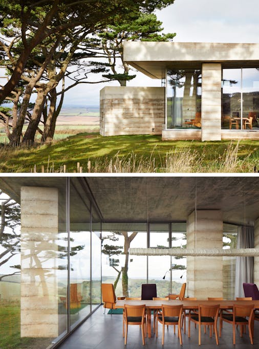 Secular Retreat is an architectural project by Swiss architect Peter Zumthor, set amid the rolling hills of South Devon. Completed in 2019, it forms part of the Living Architecture initiative, which seeks to make outstanding contemporary architecture accessible to the public through a collection of unique holiday homes designed by leading architects. Zumthor’s structure features hand-rammed concrete columns supporting a vast cantilevered roof, creating a monumental yet serene presence in the landscape. Two bedroom wings extend from the central living space, each offering expansive views over the surrounding countryside. The property is available for rent through Living Architecture, with stays starting from CHF 2200 for 3 nights.