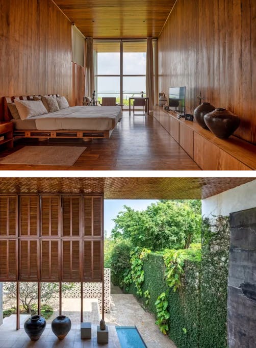 Villa is a private residence designed by the Japanese Pritzker Prize-winning architect Shigeru Ban, located near Mirissa, on the southern coast of Sri Lanka. It is perched on a lush 8-acre hilltop, offering breathtaking panoramic views over the Indian Ocean. Ban, known for his innovative use of materials—here working with local teak, woven coconut leaves, and honeycomb panels—and his sensitive integration of architecture and landscape, designed the property to blend seamlessly into its tropical surroundings—a modernist take on a coastal retreat, prioritising openness, lightness, and harmony with nature. The villa is available to rent on Airbnb, accommodating up to seven guests, with rates starting around CHF 1500 for a minimum stay of two nights.