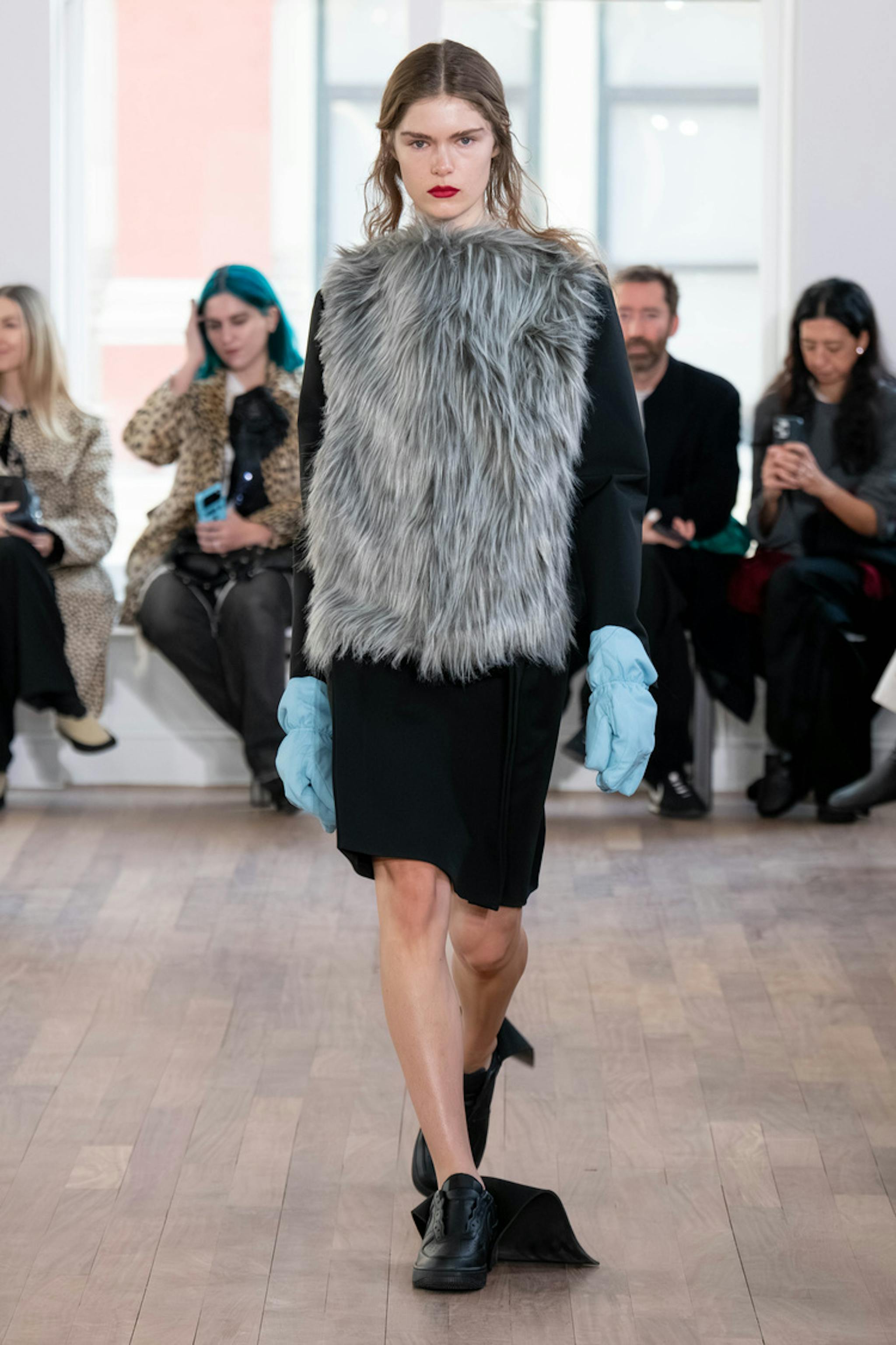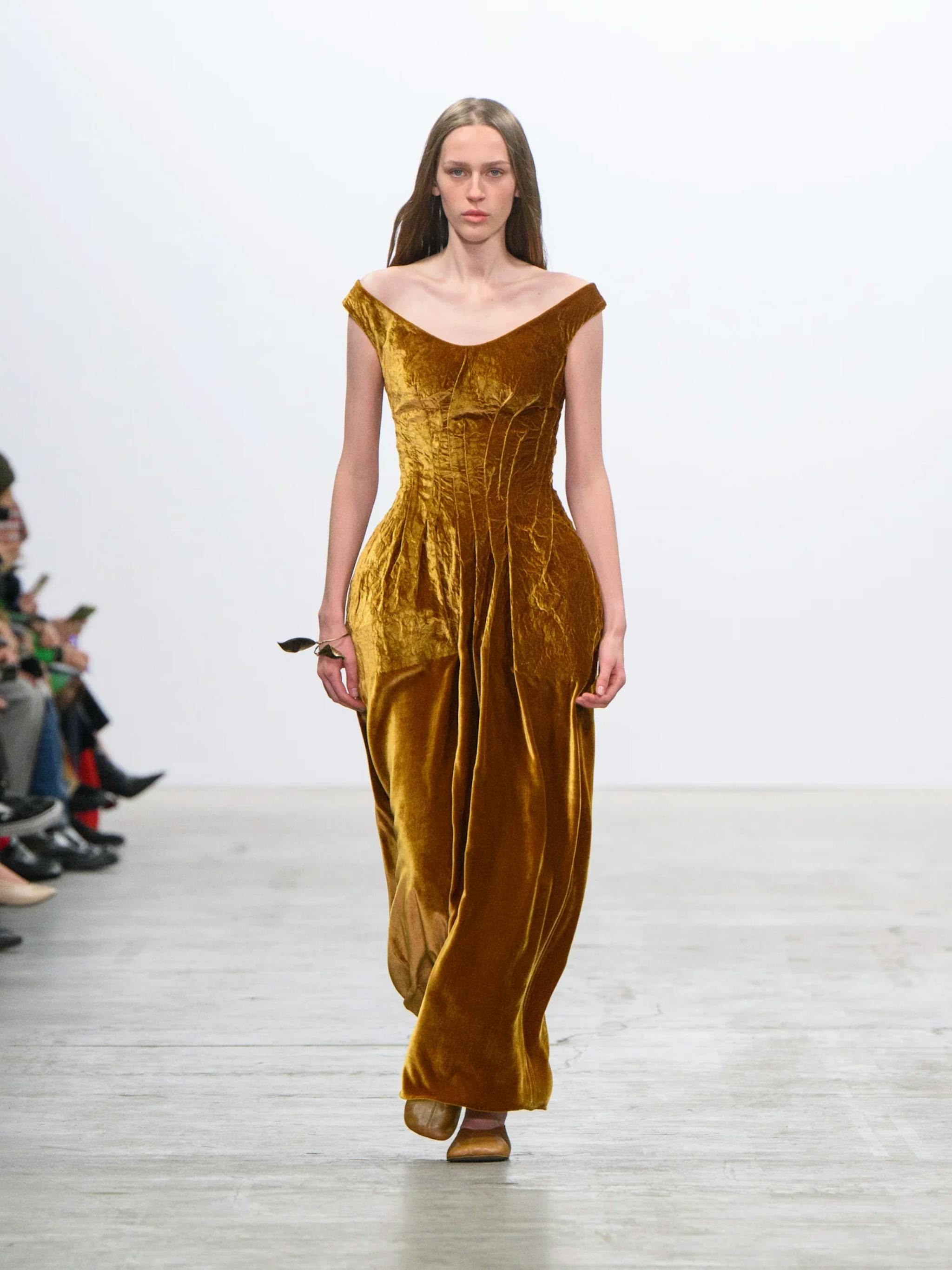 Inspirée par le film Metropolitan (1990) de Whit Stillman, la collection automne/hiver 2026 de Frances Howie pour Fforme rendait hommage aux anciens ateliers de la 7e Avenue, où l’on réalisait autrefois des pièces sur mesure, dans une méditation sur la nostalgie, la grâce et le rituel de l’élégance vestimentaire. Howie l’a qualifiée de débutante en voie de disparition. Sur le podium, les vêtements traduisaient luxe, soin et élégance réfléchie : robes suspendues à des bretelles semblables à des bijoux, manteaux sans revers, pulls effilochés, étoles en shearling pendantes et chaussures plates style chaussettes. Plus qu’un simple clin d’œil aux ateliers patrimoniaux, Howie contribue à perpétuer ces traditions en fabriquant tous les vêtements en shearling, cuir et velours de la marque directement à New York, siège de Fforme. Un geste qui mérite d’être salué.