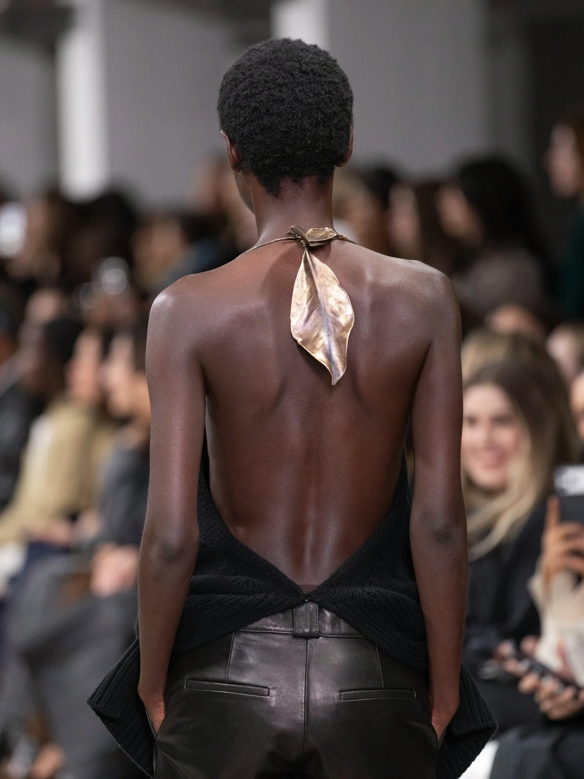 La scénographie de la collection automne/hiver 2026 de Cate Holstein pour Khaite – conçue par l’architecte et mari de Holstein, Griffin Frazen, et son équipe – dégageait une impression de rigueur. Tout comme les vêtements : silhouettes nettes, cuir lisse, brandebourgs militaires, pantalons cigarette et talons hauts. Ce n’est qu’au fil du défilé qu’elle a introduit de la douceur, une touche de romance sombre, tempérant la tension entre dureté et délicatesse qui fait le charme de son travail aux yeux du milieu de la mode. Holstein s’est inspirée de films anciens qu’elle avait récemment vus, et en particulier F for Fake. Il s’agit de faux et d’imposteurs ; de la manière dont nous valorisons l’art et l’authenticité ; de qui décide du goût et de ce qui rend quelque chose véritablement authentique, a-t-elle expliqué. À la fois visuellement riche et émotionnellement intense, ce défilé a une fois encore confirmé Cate Holstein comme une créatrice résolument en phase avec son époque.