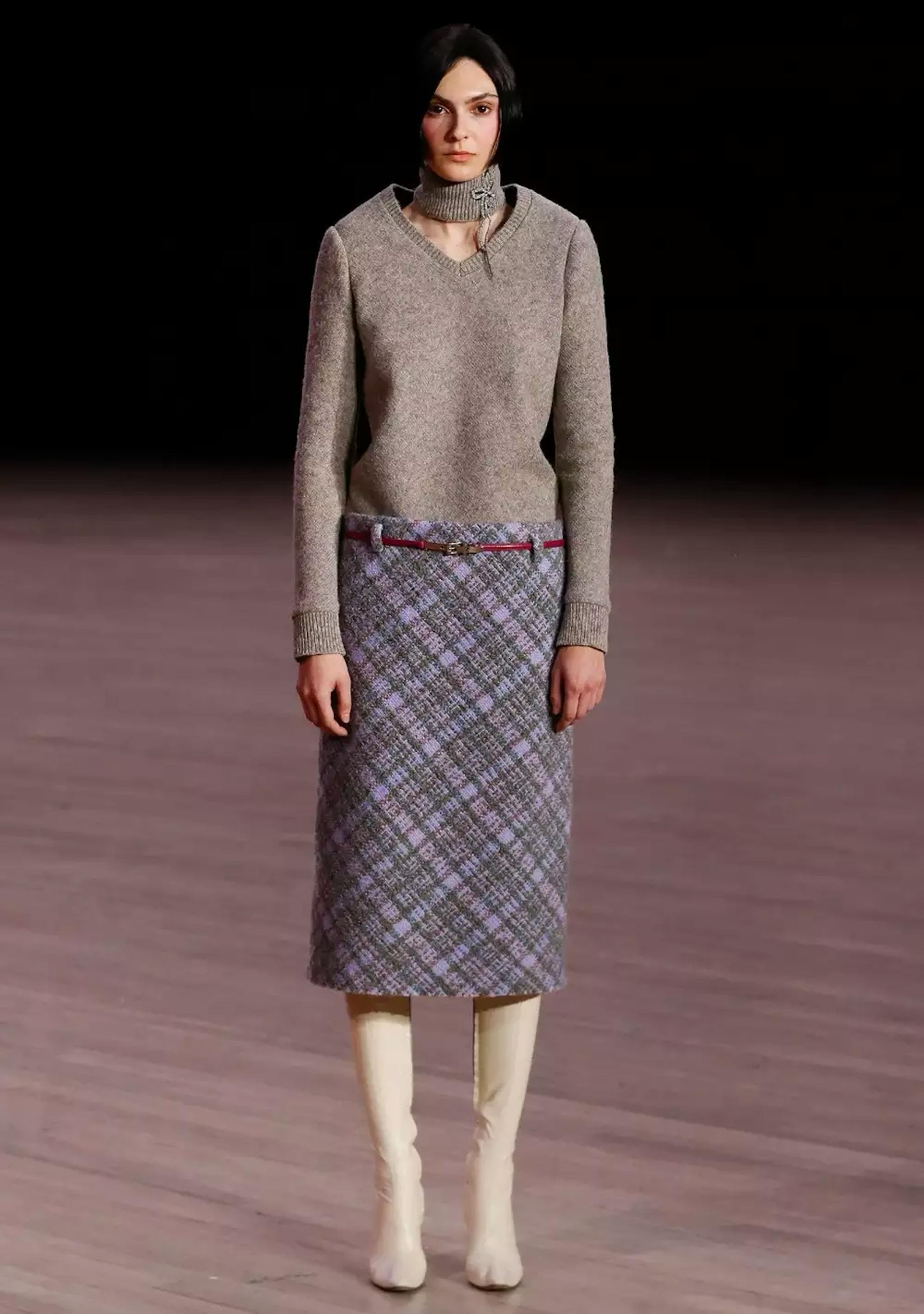 Cela fait exactement un an que Veronica Leoni a pris les rênes de Calvin Klein Collection, et elle semble de plus en plus à l’aise dans cet univers. Pour cette collection automne/hiver 2026, qu’elle qualifie d’Élégance hédoniste, elle revient aux racines de la maison, dans les années 1970 et début 1980. Jouant sur les degrés de couverture et de dévoilement – opacité ou transparence, densité ou légèreté –, elle propose un minimalisme précis, nourri par une obsession discrète du corps. Costumes sans manches, coupes slim aux dos révélateurs, robes en tweed laissant entrevoir des dos translucides, trenchs si diaphanes qu’ils semblent faits de parchemin coloré : chaque pièce traduit cette esthétique. En hommage au cinquantième anniversaire prochain de la maison, Leoni réintroduit et réinterprète le jean original du défilé Calvin Klein de 1976, un geste moins nostalgique qu’une mise en lumière subtile des codes intemporels de la maison.